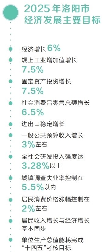 2025年是“十四五”规划收官之年,也是“十五五”规划谋篇布局的关键节点。今年,洛阳市经济发展主要目标:经济增长6%,规上工业增加值增长7.5%,固定资产投资增长7.5%,社会消费品零售总额增长6.5%,进出口稳定增长,一般公共预算收入增长3%左右,全社会研发投入强度达3.28%以上,城镇调查失业率控制在5.5%以内,居民消费价格涨幅控制在2%左右,居民收入增长与经济增长基本同步,单位生产总值能耗完成“十四五”考核目标。